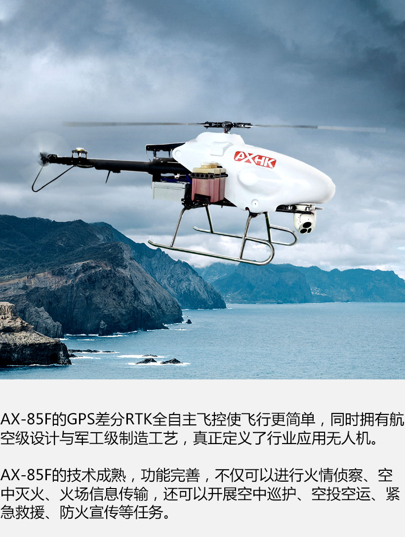 AX85F是翱翔航空自主研发的一款中型油动无人直升机,在农林应用方面具有极强的灵活性,大型、中型及小型地块皆可使用。