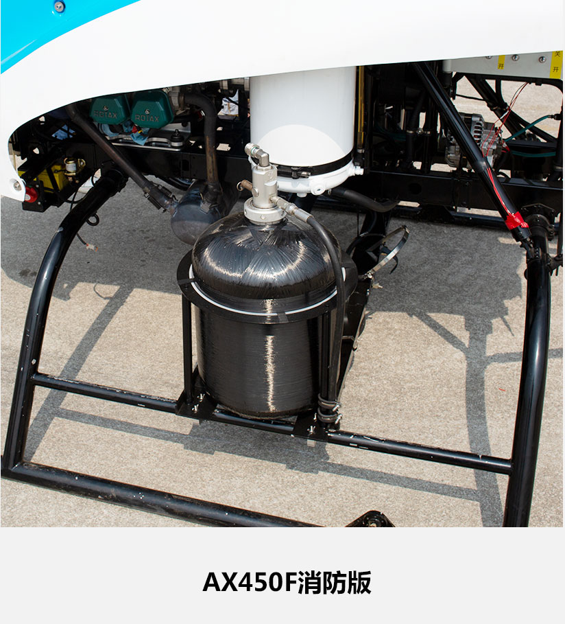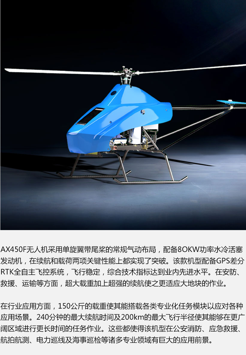 翱翔航空自主研发的AX450F无人机,采用单旋翼带尾桨的常规气动布局,配备80KW功率水冷活塞发动机,在续航和载荷两项关键性能上都实现了突破。该款机型配备GPS差分RTK全自主飞控系统,飞行稳定,综合技术指标达到业内先进水平。在农业植保方面,超大载重加上超强的续航使之更适应大地块的作业,极大地提高了作业效率和作业质量。在行业应用方面,150公斤的载重使其能搭载各类专业化任务模块以应对各种应用场景。550分钟的最大续航时间及200km的最大飞行半径使其能够在更广阔区域进行更长时间的任务作业。这些都使得该机型在航拍航测、电力巡线、公安消防及海事巡检等诸多专业领域有巨大的应用前景。
